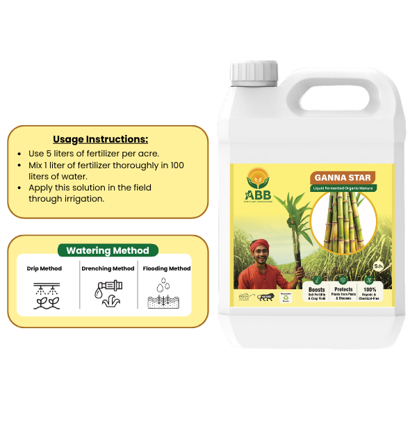 Ganna Star is a specialized liquid organic manure formulated to enhance sugarcane health, boost soil fertility, and improve crop yield. For optimal results, follow the instructions below: